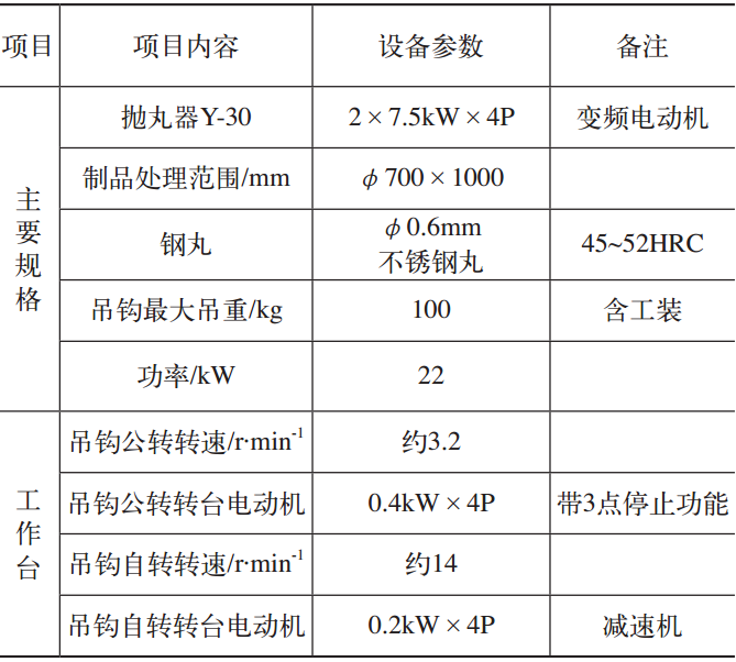 設(shè)備型號(hào)為吊鉤式拋丸清理機(jī)SHBX-III-AL,設(shè)備技術(shù)參數(shù)見(jiàn)表1。