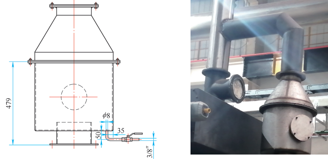 改進(jìn)措施:對(duì)原有管道進(jìn)行改造,在管道底部增加接油、排油裝置,避免油污進(jìn)入回火爐,煙道接排油裝置如圖9、圖10所示。