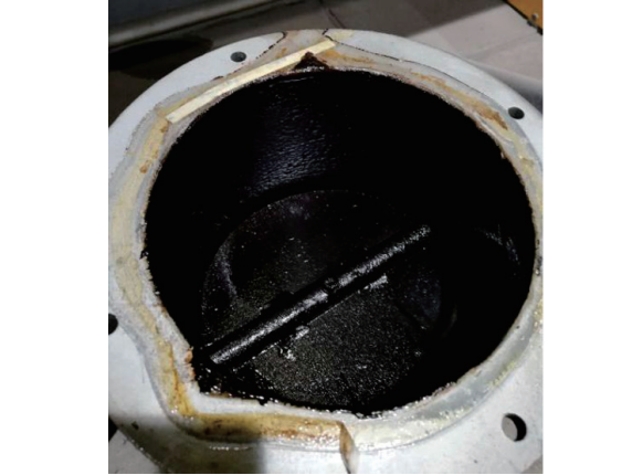 經(jīng)分析,因回火爐排氣管道垂直于爐子上方,拆開(kāi)管路檢查發(fā)現(xiàn)接口處殘留油污,當(dāng)油污直接流回回火爐時(shí),經(jīng)過(guò)風(fēng)扇攪拌后掉落至工件表面形成油污點(diǎn),如圖7、圖8所示。