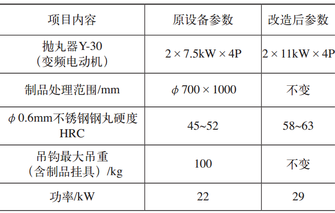 1)將拋丸器2個(gè)7.5kW的電動(dòng)機(jī)更換為2個(gè)11kW的電動(dòng)機(jī),更換2個(gè)變頻器,更換帶輪、電器件等配件,使拋丸清理時(shí)間可縮短到節(jié)拍要求范圍內(nèi)。