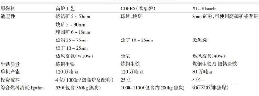 綜合不同工藝技術(shù),就高爐,歐冶爐及墨龍HIsmelt三種不同工藝從原燃料適應(yīng)性、鐵水質(zhì)量、技術(shù)成熟度、投資成本等指標(biāo)進(jìn)行比較分析如表。