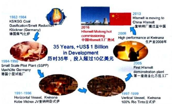 HIsmelt熔融還原工藝從1980年開始研發(fā),經(jīng)歷了初期的試驗(yàn)爐試驗(yàn)和兩個階段的的試驗(yàn)廠試驗(yàn)后,于2003年在澳大利亞的奎納納地區(qū)建造了年產(chǎn)80萬噸的世界首家商業(yè)化工廠(力拓旗下),2008實(shí)現(xiàn)設(shè)計(jì)產(chǎn)能85%。由于受世界金融危機(jī)影響,生鐵市場低迷,奎納納示范廠2008年年底關(guān)閉且不再復(fù)產(chǎn)。我國山東墨龍公司鬼使神差下(下文會講)于2012年引進(jìn)了HIsmelt的技術(shù)及大部分設(shè)備,從2012至2019年,墨龍公司在7年間與國內(nèi)外大量冶金業(yè)的大拿、學(xué)者合作,投入巨資(最新數(shù)據(jù)截止2018年16億研發(fā)資金)通過優(yōu)化進(jìn)一步工藝生產(chǎn)流程,前后經(jīng)過將近10次到付試車,如今已經(jīng)可以穩(wěn)定高效生產(chǎn)。