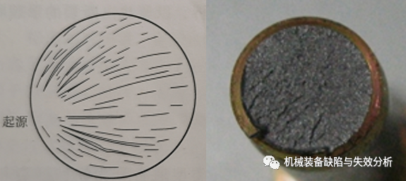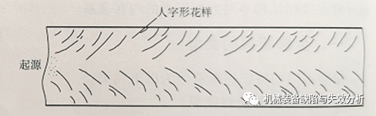 實(shí)際多晶體金屬斷裂時(shí),主裂紋向前擴(kuò)展,其前沿可能形成一些次生裂紋,這些裂紋向后擴(kuò)展借低能量撕裂與主裂紋連接便形成人字紋。