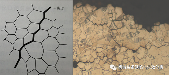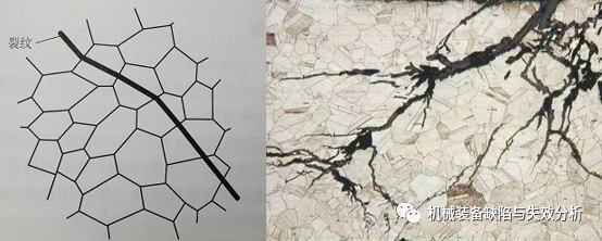 多晶體金屬斷裂時(shí),裂紋擴(kuò)展的路徑可能是不同的。根據(jù)裂紋擴(kuò)展路徑,金屬的斷裂可分為穿晶斷裂和沿晶斷裂。穿晶斷裂的裂紋穿過(guò)晶內(nèi),沿晶斷裂的裂紋沿晶界擴(kuò)展,如圖4、圖5所示。穿晶斷裂和沿晶斷裂有時(shí)可以同時(shí)發(fā)生。