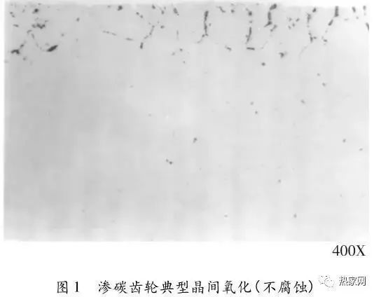 “非馬”組織金相組織觀察的方法通常為試樣不腐蝕或輕腐蝕,但對(duì)于具體的操作方法,目前國(guó)內(nèi)尚沒(méi)有明確的規(guī)范?!胺邱R”組織通常認(rèn)為是由于滲碳過(guò)程中的內(nèi)氧化所致。圖1為滲碳齒輪典型晶間氧化。