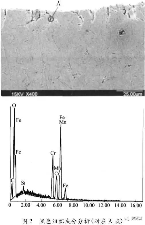 通過(guò)掃描電鏡能譜分析,內(nèi)氧化物的產(chǎn)物為Cr、Mn、Ti、Si等合金的氧化物,見(jiàn)圖2。內(nèi)氧化的存在使晶界附近合金元素貧化,容易在其兩側(cè)出現(xiàn)非馬氏體組織。內(nèi)氧化的產(chǎn)生及合金元素的貧化使附近殘余奧氏體的穩(wěn)定性降低,在隨后的淬火冷卻過(guò)程中極易發(fā)生分解,形成屈氏體和貝氏體組織的混合物。