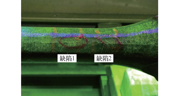 圖2  磁粉檢測缺陷1、2形貌