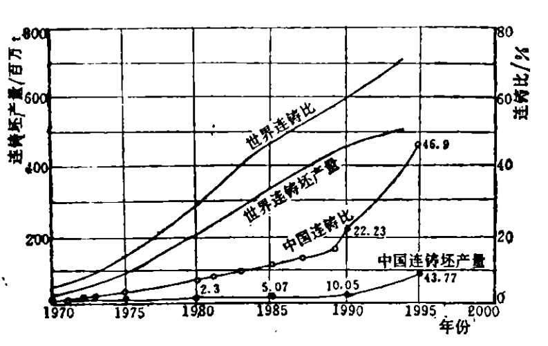 70年代世界和我國連鑄坯產(chǎn)量和連鑄比