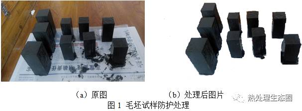 對沖擊試樣毛坯和拉伸試樣毛坯均勻涂上防滲碳劑進(jìn)行防護處理見圖1。常規(guī)滲碳工藝過程為工藝1:經(jīng)過940℃常規(guī)滲碳淬火及600℃高溫回火15h和650℃高溫回火12h,再加熱到810℃保溫30min出爐油淬。