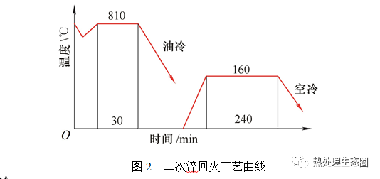 高溫滲碳工藝過程為工藝2:經(jīng)過970℃高溫滲碳淬火及600℃高溫回火15h和650℃高溫回火12h,再加熱到810℃保溫30min出爐油淬。