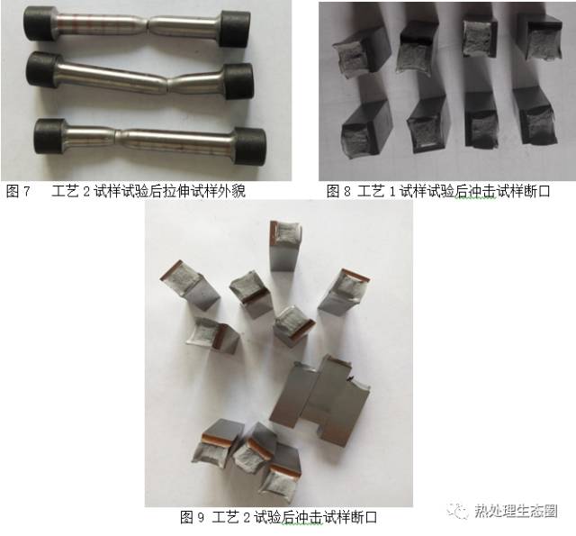 取其中3個拉伸試樣毛坯和6個沖擊試樣毛坯隨爐進(jìn)行940℃常規(guī)滲碳處理后除去滲碳層加工成力學(xué)性能樣塊。另取3個拉伸試樣毛坯和6個沖擊試樣毛坯隨爐進(jìn)行970℃高溫滲碳處理后除去滲碳層加工成力學(xué)性能樣塊。對樣塊作好標(biāo)識按圖2工藝曲線進(jìn)行二次淬回火。