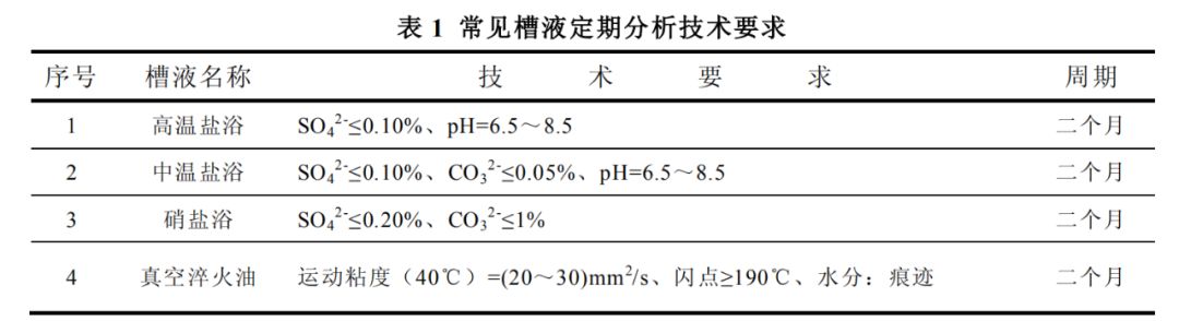 優(yōu)質(zhì)的材料是熱處理質(zhì)量控制的最初保證,如果鋼材本身存在著各種缺陷和問題,就可能在熱處理時(shí)被擴(kuò)大或者引發(fā)熱處理缺陷和問題,從而影響熱處理質(zhì)量。熱處理工藝材料是指在熱處理生產(chǎn)過程中使用,對(duì)零件熱處理質(zhì)量影響很大的材料,它包括熱處理用鹽、淬火介質(zhì)、保護(hù)氣體等。如表1所示為常見槽液定期分析技術(shù)要求。