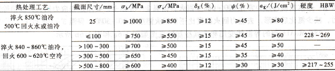 42CrMo鋼不同截面調(diào)質(zhì)后的力學(xué)性能見表3-16。