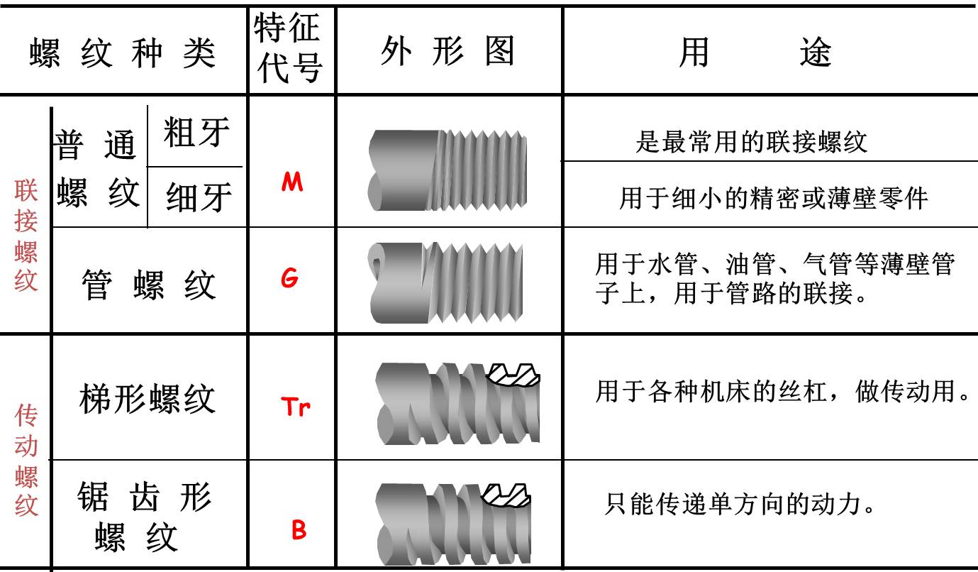 按牙型可分為三角形、梯形、矩形、鋸齒形和圓弧螺紋;