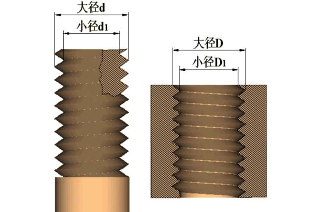螺紋有大徑(d、D)、中徑(d2、D2)、小徑(d1、D1),在表示螺紋時采用的是公稱直徑,公稱直徑是代表螺紋尺寸的直徑。