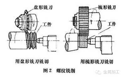 在螺紋銑床上用盤形銑刀或梳形銑刀進行銑削。盤形銑刀主要用于銑削絲桿、蝸桿等工件上的梯形外螺紋。梳形銑刀用于銑削內(nèi)、外普通螺紋和錐螺紋,由于是用多刃銑刀銑削、其工作部分的長度又大于被加工螺紋的長度,故工件只需要旋轉(zhuǎn)1.25~1.5轉(zhuǎn)就可加工完成,生產(chǎn)率很高。螺紋銑削的螺距精度一般能達 8~9級,表面粗糙度為R5~0.63微米。這種方法適用于成批生產(chǎn)一般精度的螺紋工件或磨削前的粗加工。