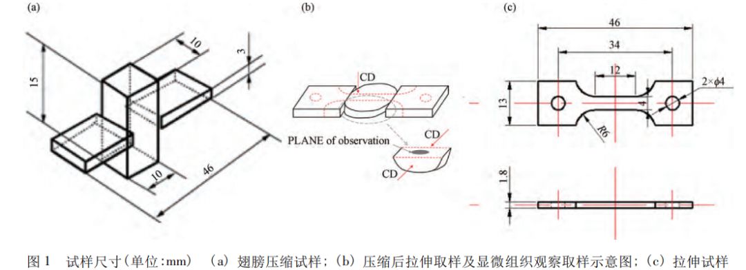 實驗用鋼為真空感應熔煉獲得 40 kg 鑄錠,化學成分 見 表 1。經(jīng) 過 1250 ℃ 保 溫 1 h 后,在 850 ~1100 ℃鍛造為 17 mm×39 mm×500 mm 的矩形方坯,鍛后正火使原始組織均勻。然后機加工成圖 1( a) 所示的翅膀試樣,在 Gleeble 1500 熱模擬試驗機上進行多道次壓縮試驗。變形工藝如圖 2 所示。1250 ℃ 保 溫 5 min 后以 50 ℃ / s 冷卻到 1100 ℃ 后進行第一道次變形。應變速率為 1 / s,變形量為 0. 36。然后以10 ℃ / s冷卻到 1000 ℃ 進行第二道次變形。依次如此直到 800 ℃進行最后一道次變形。由于此時溫度較低,因此采用 0. 1 / s 應變速率變形 0. 22,變形后空冷至室溫。每道次變形量的控制是通過應變速率和時間實現(xiàn)的。變形后的試樣如圖 1( b) 所示,加工成圖 1( c) 所示的拉伸試樣,在 REGER3010 微機控制電子萬能試驗機上進行室溫拉伸性能測試,拉伸速率為2 mm /min; 同時對變形后試樣在 200 ~ 600 ℃ 進行回火處理,回火處理后再進行室溫拉伸性能測試?;鼗鸸に嚰跋鄳氖覝亓W性能見表 2。為了研究變形后及回火后試樣的顯微組織,將對應拉伸試樣標距部分的側(cè)面組織( 圖 1b) 進行機械研磨、電解拋光、用2% ~ 3% 的 硝 酸 酒 精 溶 液 侵 蝕。利 用 ZeissSUPERA55 掃描電鏡( SEM) 進行組織觀察。為進一步觀察亞微觀組織,選取部分回火工藝條件的試樣切割成 厚 度 為 0. 3 mm 的 薄 片,機械減薄到厚度為50 μm 以下,用雙噴技術(shù)獲得薄膜 TEM 試樣,利用Hitachi-800 型透射電鏡( TEM) 觀察組織變化。