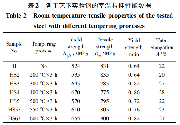 表 2 給出了不同回火工藝后的室溫拉伸性能??梢钥闯? 空冷組織具有較高的強度,屈服強度和抗拉強度分別達到了 524 MPa 和 831 MPa,屈強比只有0. 65,保持良好的塑性,伸長率 22%,具有較好的綜合力學性能。不同溫度回火后,與空冷組織室溫力學性能相比,各個溫度下屈服強度均有不同程度升高,且可大致分成 3 個區(qū)間: 200 ~ 400 ℃ 之間為第一區(qū)間,屈服 強 度 逐 漸 升 高,到 400 ℃ 回火時達到最高670 MPa; 400 ~ 500 ℃ 回火為第二區(qū)間,屈服強度開始降低,但 500 ℃時仍高于空冷組織; 回火溫度繼續(xù)升高時為第三區(qū)間,600 ℃ 時屈服強度又逐漸升高。而各個回火溫度下的抗拉強度均低于空冷組織。