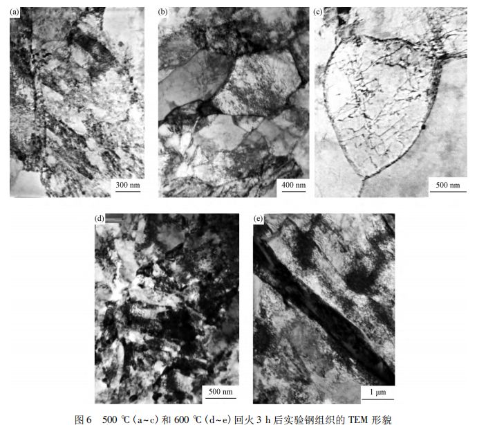 500 ℃回火時,少量 M-A 島分解,部分 BF 板條間殘留奧氏體薄膜分解析出小顆粒狀碳化物 ( 圖6a) ,但數(shù)量有限; BF 及等軸鐵素體中仍然存在較高位錯密度( 圖 6b) ,同時由于回火溫度的升高,局部區(qū)域鐵素體內(nèi)部的高密度位錯開始發(fā)生回復,位錯對消重排,形成亞晶界( 圖 6c) 。溫度升高到 600 ℃ 時,雖 然 M-A 島加快分解,大量大塊的 M-A 島發(fā)生分解,在BF 基體上、BF 界面及鐵素體晶界等處析出較多不同尺寸的碳化物( 圖 6d) ,但仍然有很多 M-A 島及板條間殘留奧氏體薄膜穩(wěn)定存在( 圖 6e) 。此外,部分鐵素體基體發(fā)生回復及再結(jié)晶過程,BF 基體及等軸鐵素體中還有較高位錯密度( 圖 6e) 。