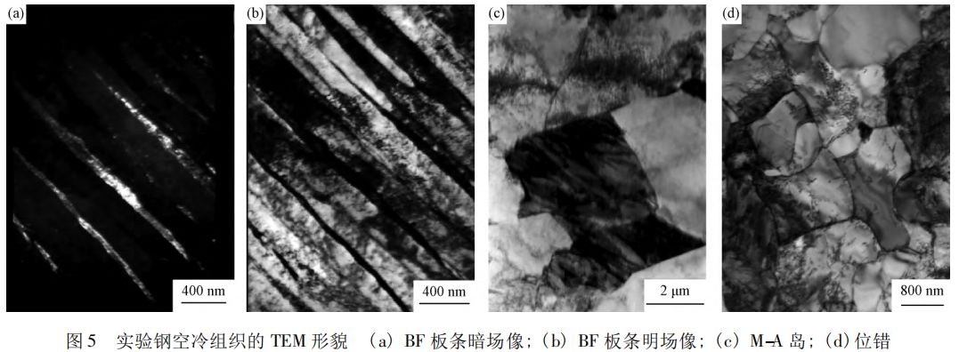 貝氏體的轉(zhuǎn)變溫度介于珠光體和馬氏體轉(zhuǎn)變溫度之間,它同時具有高溫轉(zhuǎn)變產(chǎn)物的塑韌性和低溫轉(zhuǎn)變產(chǎn)物的強度,具有良好的強韌性配合。本實驗的鋼中粒狀貝氏體是在貝氏體鐵素體基體上彌散分布著M-A 島; 貝氏體鐵素體板條具有較高的位錯密度( 圖5b) ,可起到細晶強化和位錯強化的作用; 同時由于M-A 島是硬質(zhì)相,而且這些 M-A 島是以細小彌散的方式析出,所以它們能夠與位錯發(fā)生交互作用,阻礙位錯的運動,即通過復相強化的方式提高鋼的強度。