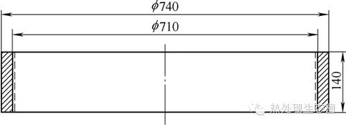 某型號風(fēng)電增速箱用特大特輕軸承套圈材料為42CrMo,預(yù)處理為調(diào)質(zhì),硬度300HBW左右。零件尺寸規(guī)格見圖1,零件外徑與內(nèi)經(jīng)的比值為1.042。
