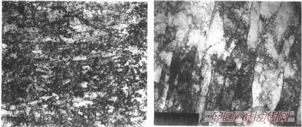 圖1  N80管材的光學顯微組織  400×               2  透射電鏡下的鐵素體板條束  14000×