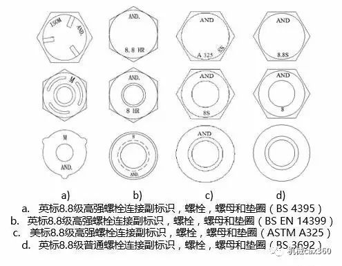 普通螺栓和高強(qiáng)螺栓的標(biāo)示是對(duì)同等級(jí)螺栓現(xiàn)場(chǎng)識(shí)別的基本方法。由于英美標(biāo)準(zhǔn)中對(duì)于高強(qiáng)螺栓扭矩值計(jì)算的取值并不相同,所以識(shí)別兩種標(biāo)準(zhǔn)的螺栓也有必要。
