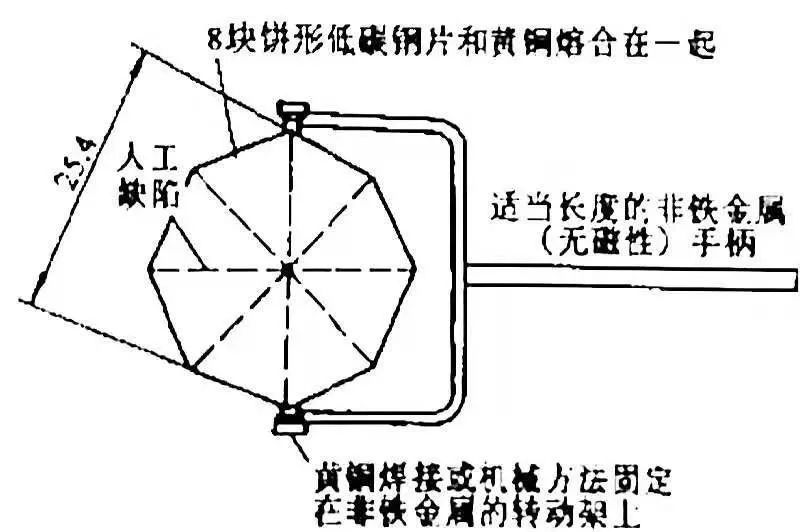 磁場指示器如圖5所示。其用途與A型試片基本相同,但不適于用作磁場強(qiáng)度及其分布的一種定量指標(biāo) 。