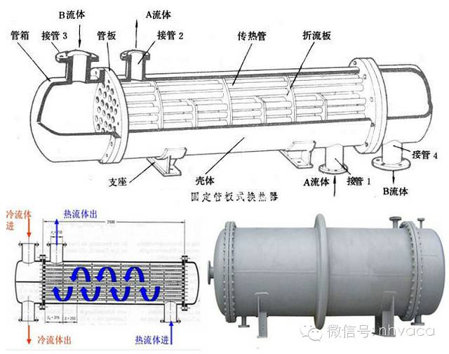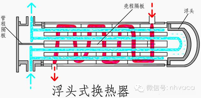 管殼式換熱器:是以封閉在殼體中管束的壁面作為傳熱面的間壁式換熱器,這種換熱器結(jié)構(gòu)較簡單、操作可靠,可用各種結(jié)構(gòu)材料(主要是金屬材料)制造,能在高溫、高壓下使用,是目前應(yīng)用最廣的類型。(設(shè)計制造遵循標(biāo)準(zhǔn):國外 TEMA   ASME   國內(nèi)  GB151、GB150)暖通南社