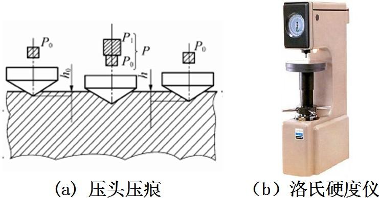洛氏硬度是用規(guī)定的壓力,將金剛石圓錐體壓頭壓入材料的表面,測(cè)量壓痕深度h來?yè)Q算(圖2-13) :