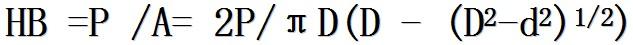 布氏硬度是用一定載荷P,將淬火鋼球壓頭壓入被測(cè)材料表面,保持一定時(shí)間后卸載,根據(jù)壓入的直徑d的壓痕面積A(圖2-12)來獲得。計(jì)算式為: