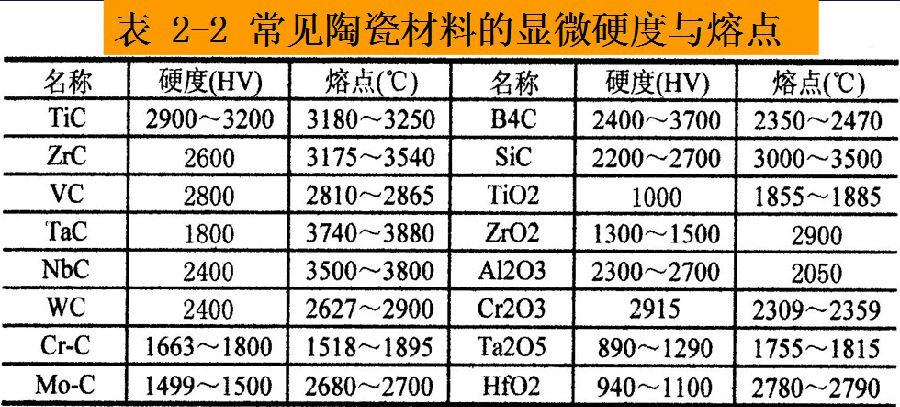 由于顯微硬度的壓痕小,故被測(cè)材料要做成金相試樣。因此,它適合于陶瓷材料的硬度測(cè)定,見表2-2。