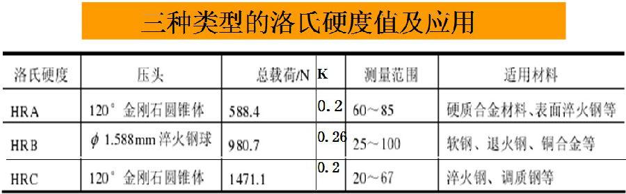 根據(jù)壓頭和載荷的大小,洛氏硬度分為HRC、HRB 、 HRA三種類型 (見下表)。