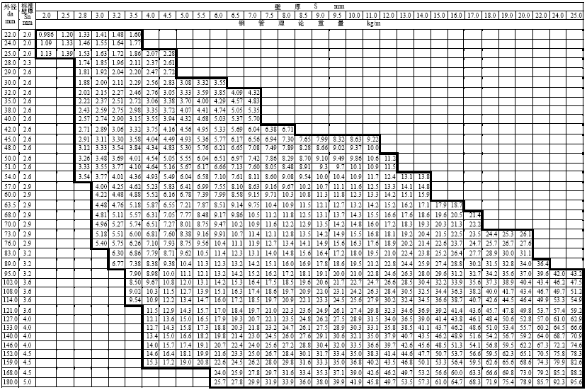 4.4.1 鋼管按實(shí)際重量交貨,也可按理論重量交貨。鋼管每米理論重量列于表1~表4(鋼的密度按7.85kg/dm)。