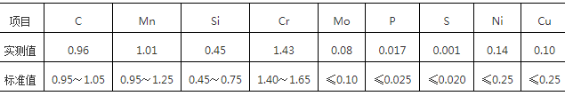 對(duì)外圈進(jìn)行取樣,大小為15mm×15mm×15mm,采用直讀光譜儀進(jìn)行化學(xué)成分分析,檢驗(yàn)結(jié)果如表1所示,其化學(xué)成分符合GB/T18254—2016中GCr15SiMn標(biāo)準(zhǔn)要求。