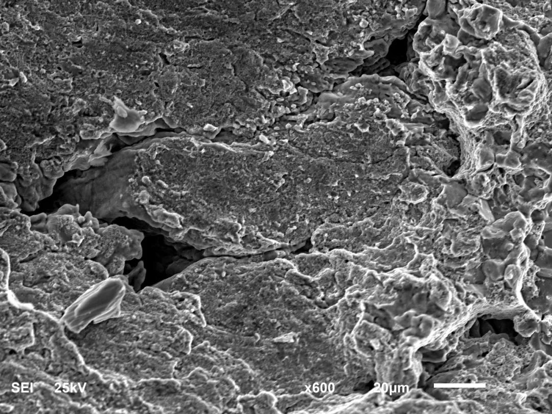 最后,掃描電鏡斷口分析。制取孔洞部位斷口后,在JSM-6610LV掃描電鏡下觀察,可見(jiàn)斷口上分布有大量有尖角狀孔洞,孔內(nèi)局部有金屬熔融形貌,如圖4所示。