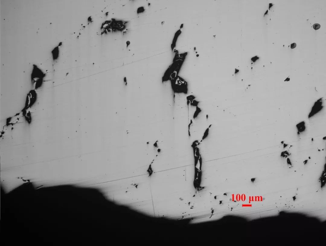 其次,金相觀察。制取孔洞部位截面金相試樣后在OLYMPUSGX51顯微鏡下觀察,可見(jiàn)截面上有大量不規(guī)則尖角狀孔洞分布,邊緣有氧化,個(gè)別孔洞深不見(jiàn)底,其金相形貌如圖3所示。