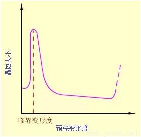(2)預(yù)先變形度  變形度的影響主要與金屬變形的均勻度有關(guān)。變形越不均勻, 再結(jié)晶退火后的晶粒越大。變形度很小時(shí),因不足以引起再結(jié)晶,晶粒不變。當(dāng)變形度達(dá)到2~10%時(shí),金屬中少數(shù)晶粒變形,變形分布很不均勻,所以再結(jié)晶時(shí)生成的晶核少,晶粒大小相差極大,非常有利于晶粒發(fā)生吞并過程而很快長(zhǎng)大,結(jié)果得到極粗大的晶粒。使晶粒發(fā)生異常長(zhǎng)大的變形度稱作臨界變形度。生產(chǎn)上應(yīng)盡量避免在臨界變形度范圍內(nèi)的塑性變形加工。超過臨界變形度之后,隨變形度的增大,晶粒的變形更加強(qiáng)烈和均勻,再結(jié)晶核心越來越多,因此再結(jié)晶后的晶粒越來越細(xì)小。但是當(dāng)變形度過大(約≥90%)時(shí), 晶??赡茉俅纬霈F(xiàn)異常長(zhǎng)大,一般認(rèn)為它是由形變織構(gòu)造成的。