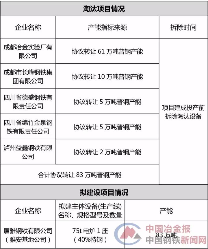 這兩家企業(yè)分別通過減量5萬噸產(chǎn)能,置換重組為四川圣德鋼鐵有限公司(暫定名),減量的10萬噸產(chǎn)能轉讓給眉雅鋼鐵有限公司(雅安基地公司),其余產(chǎn)能全部用于此次置換。