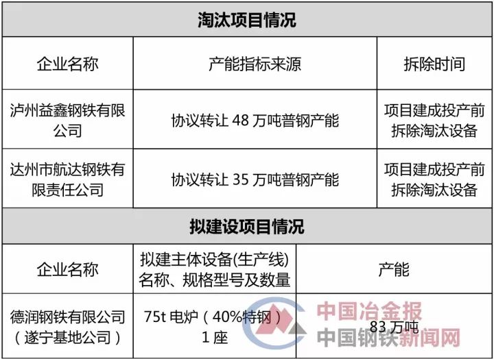 瀘州益鑫鋼鐵有限公司48萬噸煉鋼產(chǎn)能轉讓給德潤鋼鐵有限公司(遂寧基地公司),2萬噸煉鋼產(chǎn)能轉讓給眉雅鋼鐵有限公司(雅安基地公司),2萬噸煉鋼產(chǎn)能直接淘汰,其余產(chǎn)能全部用于此次置換;四川省瀘州江陽鋼鐵有限公司50萬噸煉鐵產(chǎn)能轉讓給四川德勝集團釩鈦有限公司,其余產(chǎn)能全部產(chǎn)能用于此次置換。