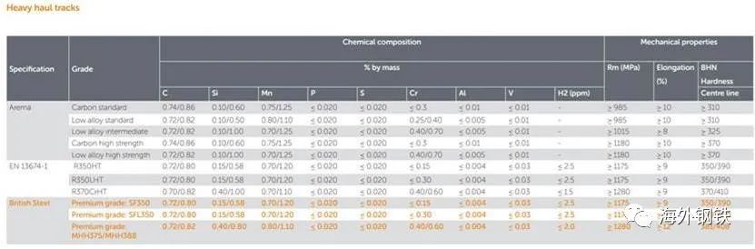 (3)MHH(MaximumHeadHardness)系列。有卓越的耐磨性,法國HAYANGE生產(chǎn)。MHH等級,如MHH375和MHH38。MHH系列是熱處理范圍內(nèi)最耐磨的鋼軌。由最好的珠光體微觀結(jié)構(gòu)組成,具有優(yōu)異的耐磨性和抗?jié)L動接觸疲勞性能,塑性變形良好,同時具有世界一流的低殘余應(yīng)力(<50MPa),符合CEN(歐洲標(biāo)準(zhǔn)化委員會)、AREMA(美國鐵路工程與道路維護(hù)協(xié)會)和其他規(guī)范。用于緊密彎曲和重載軌道,減少鋼軌退化和底部疲勞,延長鋼軌壽命。