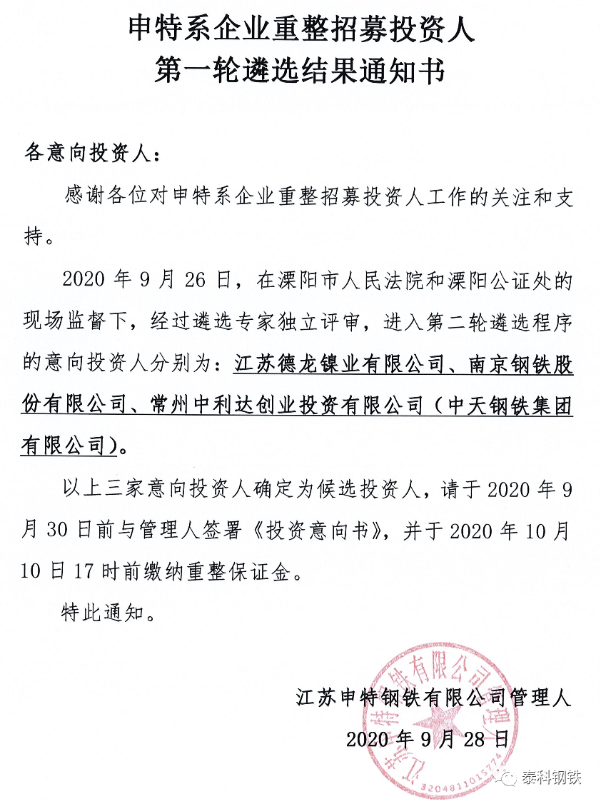 2023年9月26日,在溧陽市人民法院和溧陽公證處的現(xiàn)場監(jiān)督下,經過遴選專家獨立評審,進入第二輪遴選程序的意向投資人分別為:江蘇德龍鎳業(yè)有限公司、南京鋼鐵股份有限公司、常州中利達創(chuàng)業(yè)投資有限公司(中天鋼鐵集團有限公司)。
