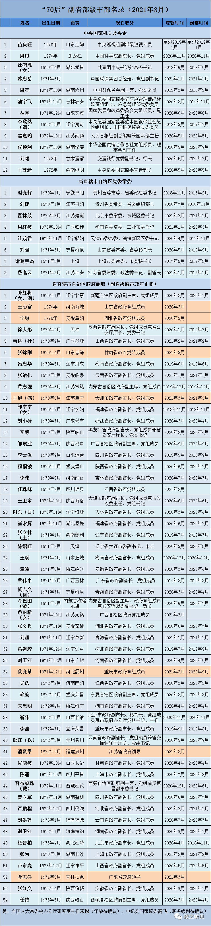 目前,全國“70后”省副部級領(lǐng)導(dǎo)至少已有74人。其中,中央和國家機(jī)關(guān)及央企的副部級領(lǐng)導(dǎo)至少有12人,省、自治區(qū)、直轄市的省級黨委常委有8人,省、自治區(qū)、直轄市的省級政府副職及副省級城市政府正職共有54人,名單詳見下表。