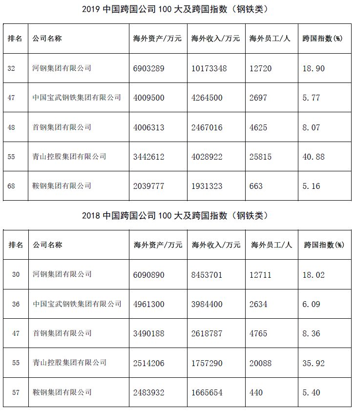 那究竟國(guó)內(nèi)鋼鐵相關(guān)企業(yè)的國(guó)際化情況如何?根據(jù)中國(guó)企業(yè)聯(lián)合會(huì)、中國(guó)企業(yè)家協(xié)會(huì)日前發(fā)布的“中國(guó)100大跨國(guó)公司及跨國(guó)指數(shù)”,2019中國(guó)100大跨國(guó)公司的平均跨國(guó)指數(shù)為15.96 %,較上年提高0.16個(gè)百分點(diǎn)。但總體上看,中國(guó)跨國(guó)公司與世界跨國(guó)公司相比仍有較大差距。其中,有5家鋼鐵生產(chǎn)企業(yè)上榜,河鋼集團(tuán)海外收入首次突破1000億元,為在海外收入最高的鋼鐵企業(yè),位列百?gòu)?qiáng)榜第32位,中國(guó)寶武鋼鐵集團(tuán)、首鋼集團(tuán)、青山控股集團(tuán)和鞍鋼集團(tuán)分列其后(見下表)。