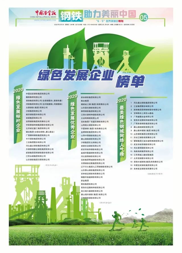 在一年一度的“6·5”環(huán)境日到來(lái)之際,由中國(guó)冶金報(bào)社組織的2020“尋找最美綠色鋼城”評(píng)選結(jié)果重磅揭曉。50家鋼企在眾多候選企業(yè)中脫穎而出,中國(guó)寶武鋼鐵集團(tuán)有限公司等20家鋼企獲評(píng)“2020綠色發(fā)展標(biāo)桿企業(yè)”,新余鋼鐵集團(tuán)有限公司等30家鋼企獲評(píng)“2020綠色發(fā)展優(yōu)秀企業(yè)”。