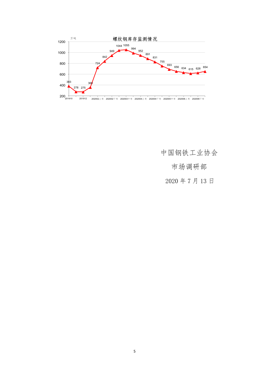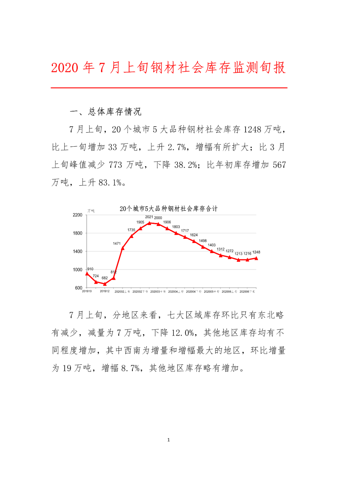 2020年7月13日,中國鋼鐵工業(yè)協(xié)會(huì)發(fā)布2020年7月上旬鋼材社會(huì)庫存檢測旬報(bào),20個(gè)城市5大品種鋼材社會(huì)庫存1248萬噸,比上一旬增加33萬噸,上升2.7%,增幅有所擴(kuò)大;比3月上旬峰值減少773萬噸,下降38.2%;比年初庫存增加567萬噸,上升83.1%。