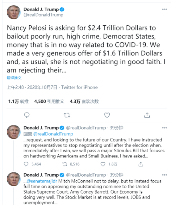 特朗普推文表示,我們給出了非常慷慨的1.6萬(wàn)億美元的方案,而眾議院議長(zhǎng)南希·佩洛西,一如既往的沒(méi)有真誠(chéng)談判的意思。且他已指示白宮代表即時(shí)停止與民主黨人的磋商工作,押后直至11月大選后、當(dāng)他贏(yíng)得連任才立即恢復(fù)商討,屆時(shí)共和黨將會(huì)通過(guò)一項(xiàng)重大刺激方案,向勤勞的美國(guó)民眾和中小企業(yè)提供援助。