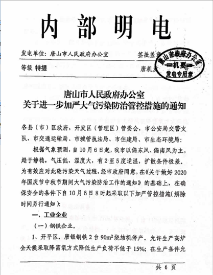 唐山市關(guān)于進(jìn)一步加嚴(yán)大氣污染防治管控措施的通知。各縣(市)區(qū)政府,開(kāi)發(fā)區(qū)(管理區(qū))管委會(huì),市公安局交警支隊(duì)、市交通運(yùn)輸局、市城管執(zhí)法局、市住建局、市生態(tài)環(huán)境局:根據(jù)氣象預(yù)測(cè),自10月6日起,我市以偏東風(fēng)、偏南風(fēng)為主,趨于靜穩(wěn),氣壓低,濕度大,有2至5度逆溫,擴(kuò)散條件板差。為有效應(yīng)對(duì)此輪污染天氣過(guò)程,經(jīng)市政府同意,在《關(guān)于做好2020年國(guó)慶節(jié)中秋節(jié)期間大氣污染防治工作的通知》的基礎(chǔ)上,在確保安全的條件下自10月6日8時(shí)起采取加嚴(yán)管控措施(解除時(shí)間另行通知)。