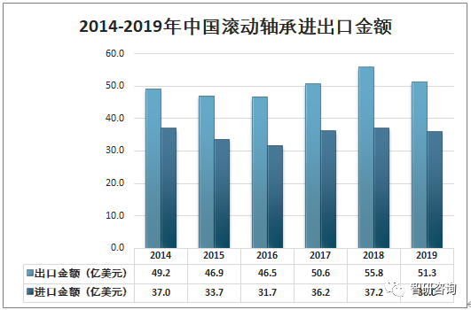 2019年中國滾動軸承出口金額為51.3億美元,同比下降8.1%;中國滾動軸承進(jìn)口金額為36億美元,同比下降3.2%。