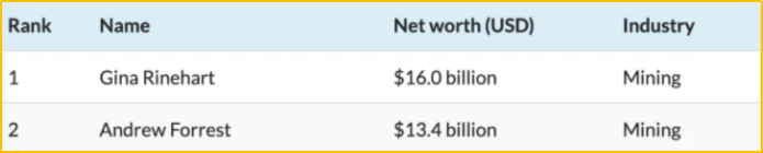最近看到澳洲富豪排行榜出爐了,澳洲CEO WORLD雜志公布了2020年澳洲富豪榜指數(shù),上榜的前兩位都是澳洲鐵礦公司的老板。榜首第一位是澳洲私人公司漢考克勘探公司(Hancock Prospecting)的老板吉娜,身價(jià)160億美元,她是著名的鐵礦大漢克的唯一女兒,她的公司擁有世界第五大鐵礦公司Roy Hill的70%的股份;榜上的第二位富翁是FMG公司的老板Andrew Forrest,身價(jià)為134億美元。
